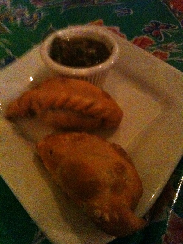 Empanadillas con Pebre - crisp empanadas filled with beef picadillo, served with spicy Chilean cilantro sauce